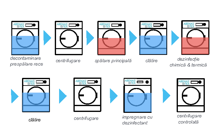 Programul de spalare, dezinfectie si preimpregnare cu dezinfectant a textilelor de sanitatie (mopurilor si lavetelor) – este un proces automatizat, constand in spălarea, dezinfectarea chimica si termica (90°C), preimpregnarea mopurilor și lavetelor cu dezinfectant in echipamente de spălat industriale / profesionale cu caracter specific, care au presetate programe de spalare in softul propriu, nefiind necesara interventia umana in prelucrarea textilelor pentru decontaminare, spalare, dezinfectare chimica si termica, si preimpregnare, sau in dilutia substantelor necesare preimpregnarii fiind conectate la un sistem automatizat de dozare cu monitorizare a cantitatiilor de substante (detergenti si dezinfectanti) utilizate in proces. De asemenea, sistemul software permite presetarea a unor programe (spalarea, dezinfectia si preimpregnare cu dezinfectant) diferite in functie de nivelul de risc utilizat in cadrul unitatii medicale, acest proces automatizat asigura un control intern riguros privind trasabilitatea mopurilor si a lavetelor, precum si a destinatiei acestora, in combinatie cu codul de culori implementat.